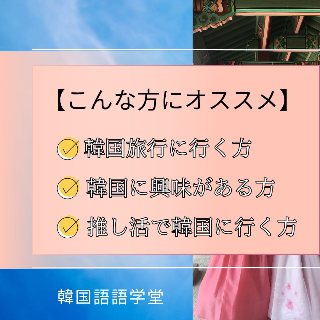 これから韓国旅行へ行く予定の方や韓国語をこれから学びたい方にぴったりな「旅行のための韓国語フレーズ」は、旅行や日常生活で使えるフレーズを効率的に学ぶことができる講座です。